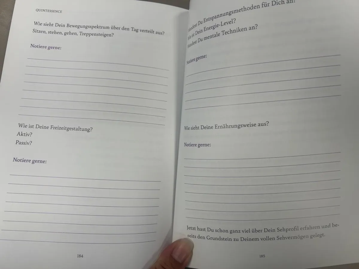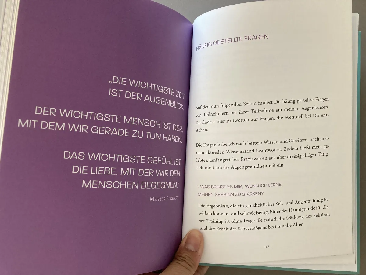 Das Buch liegt immer gut sichtbar auf meinem Schreibtisch und animiert mich zu meinen regelmäßigen Übungen. Eine klare Empfehlung für alle, die ihren Augen und sich selbst etwas Gutes tun wollen."